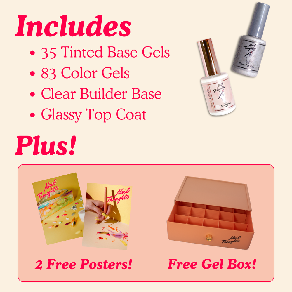 Get the Nail Thoughts Full Gel Collection and save! Includes all 47 tinted bases, 94 color gels*, the Clear Builder Base, and Glassy Top Coat for a total of 143 bottled gels!