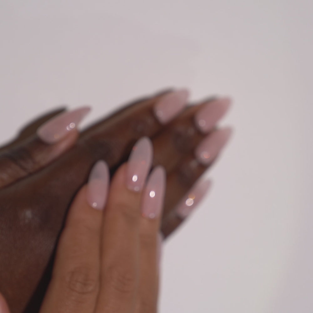 "A light peachy-pink base coat with a shimmer. Think of this tinted base coat as a subtle color mix between the fan favorites Peach Base and Strawberry Milk Base. It’s less opaque than those two but has the perfect mix of hue between them. It’s a subtle peachy pink hue tinted base gel with very micro glowy glitter within it!" - Katie