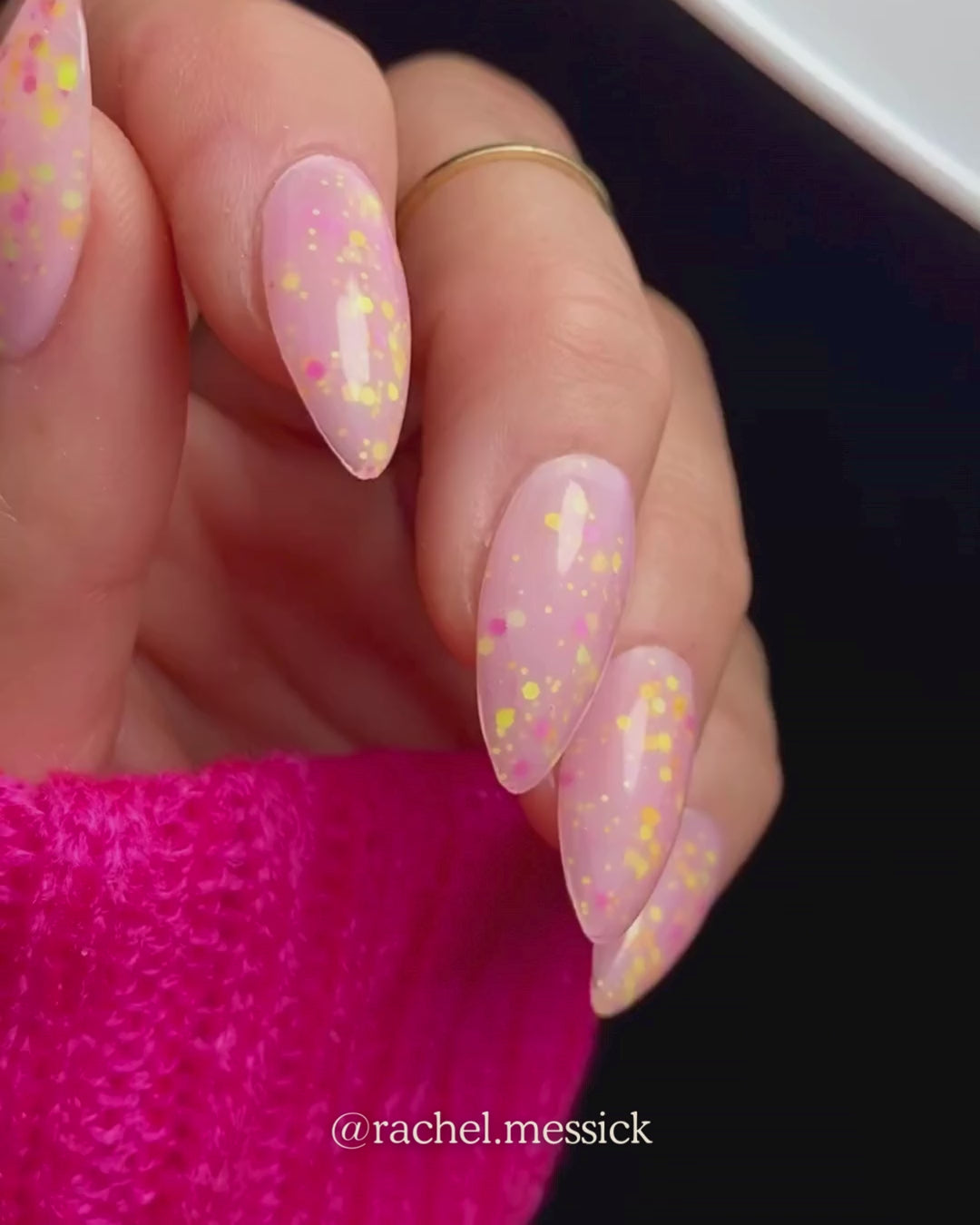A light milky pink with yellow, pink, and green confetti pieces in it.