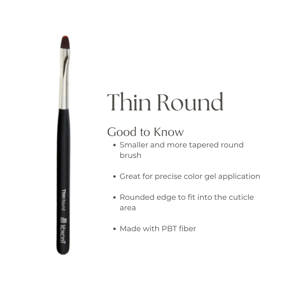 The Thin Round Brush is a smaller and more tapered round brush; it is ideal for precise and even color gel application. It features the same rounded edge suitable for applications in the cuticle area. Made of PBT fiber.